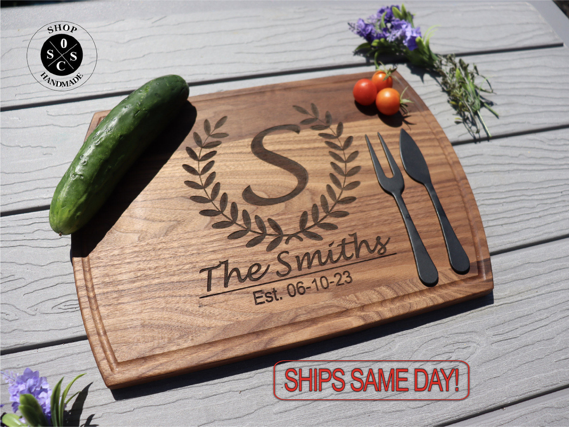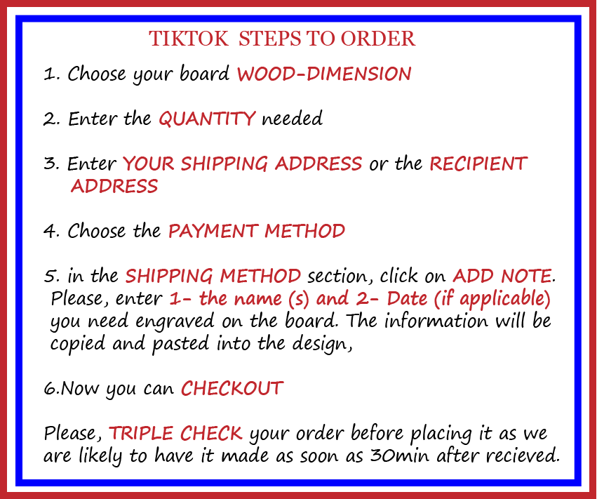 1. CHOOSE YOUR BOARD - Choose a combination of the size and wood type from the drop down menu. 2. Enter the Quantity Needed 3. Enter YOUR address or recipient address 4. Choose payment method 5. In the SHIPPING METHOD section, click on ADD A NOTE, to enter your personalization
